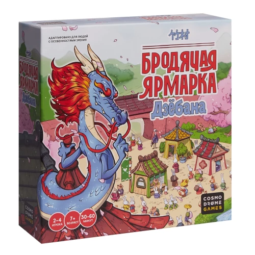 Хотите интересно провести время с детьми, в кругу семьи или с друзьями? «Бродячая ярмарка Дзёбана» — идеальная настольная игра на вечер. Партии занимают всего 30 минут и каждый раз дарят новые впечатления! В чем суть игры? Вас с соперниками нанимает дракон Дзёбан Такемура, который устраивает ярмарку в японском городке. Каждый ход нужно проектировать и строить лавки по цветам так, чтобы все продавцы остались довольны. Кроме этого, у каждого игрока будет карта с личным заданием, за которое вы получите или потеряете очки в конце игры. Обгонять соперников помогут карты с полезными бонусами и смекалка. Внутри коробки вас ждут яркие модели лавок и драконов. Дети останутся в восторге! Они смогут быстро запомнить правила и будут развивать умение мыслить. Вы можете поиграть вдвоем с ребенком или собрать компанию из четырех человек. Каждая партия — смесь удачи, веселья и вашей стратегии. «Бродячая ярмарка Дзёбана» — настольная игра, где вы словно переместитесь в японский городок со своей уютной атмосферой. Выполняйте задания лучше соперников, чтобы стать любимчиком дракона и показать другим, кто здесь главный строитель города!