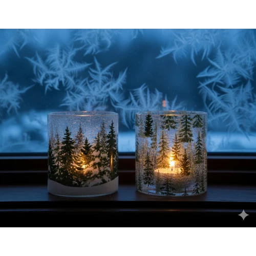 Каждый подсвечник украшен детальным изображением заснеженного леса, выполненным в нежных, прозрачных тонах. Этот декор создает ощущение глубины и объема, позволяя огню свечи мягко просвечивать сквозь узоры, создавая завораживающие тени и игру света.