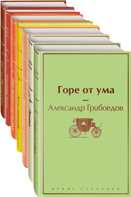 В комплект входят следующие книги серии: «Горе от ума» (с иллюстрациями), «Эмма», «Маленькие женщины», «Лето, прощай», «Над пропастью во ржи», «451° по Фаренгейту» и «Хорошие жены».
